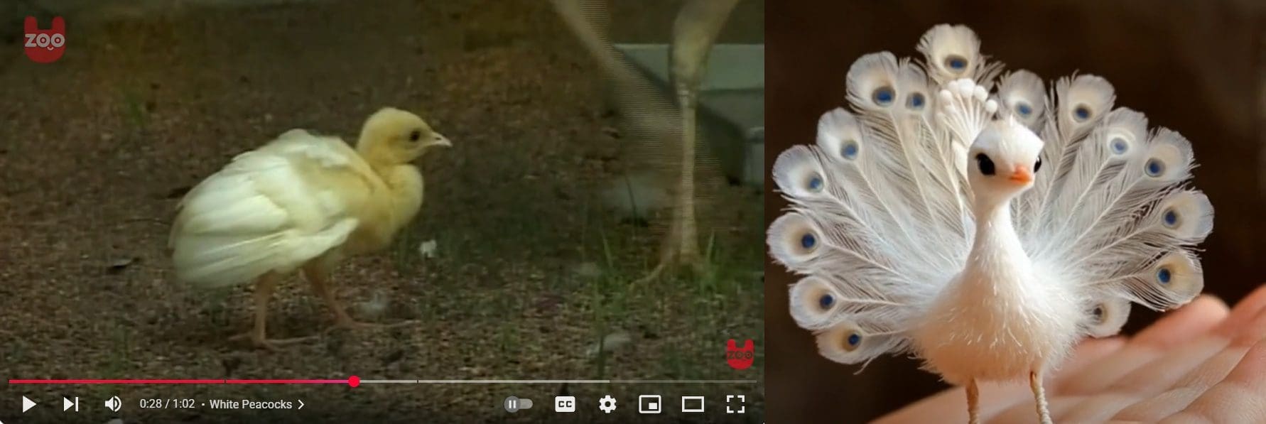 ويمكن مقارنة صغير طاووس أبيض حقيقي نادر فقس في الهند مع صورة من مقطع الادعاء