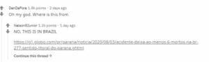و بعد البحث في تعليقات المشاهدين ذكر أحدهم أنّ المقطع يعود لحادث حصل في البرازيل وأضاف رابط الخبر