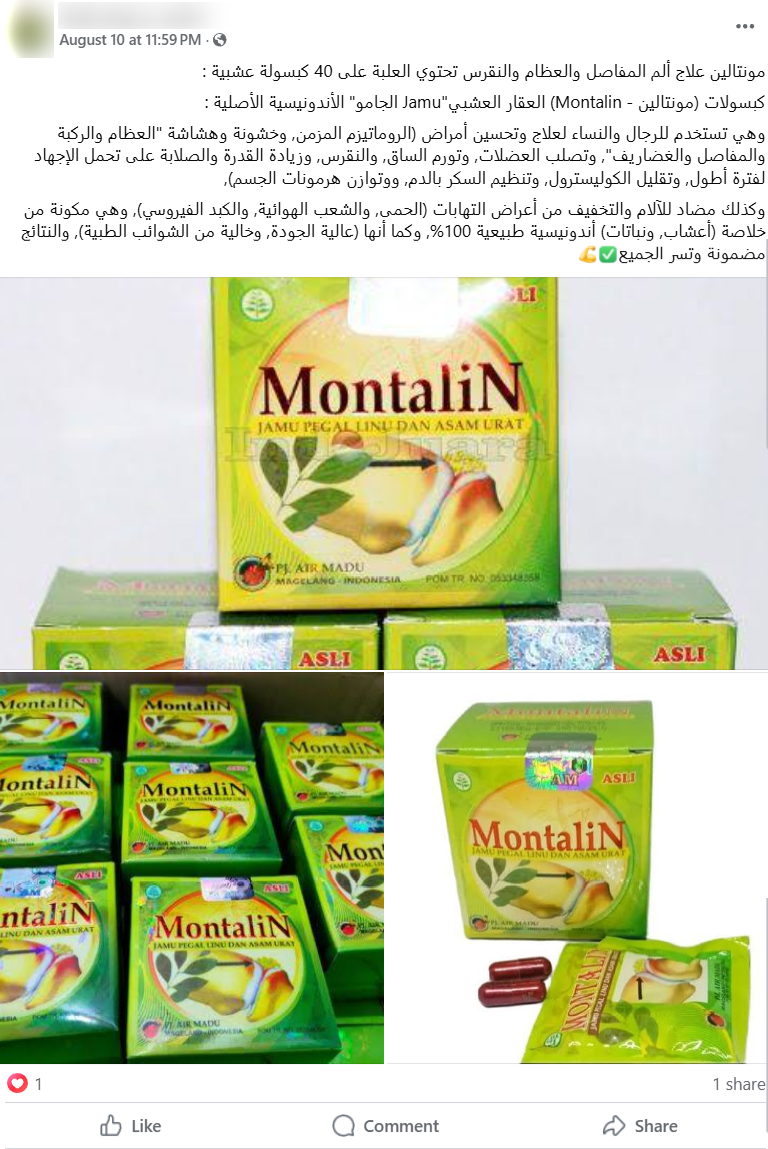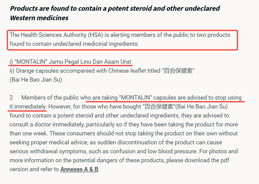 ثانيًا: أصدرت هيئة العلوم الصحية في سنغافورة تحذيرًا للجمهور من منتج “مونتالين”، الذي يدّعي انه علاج الألم والعديد من الحالات الطبية. يُعتبر هذا المنتج غير قانوني، حيث تم اكتشاف وجود مكونات دوائية غير مُعلنة وغير مصرح بها. تم الإبلاغ عن حالات صحية خطيرة بعد تناولهم منتج “مونتالين”، الذي يُسوّق على أنه دواء عشبي لتخفيف الألم، منها: سيدة تجاوزت السبعين من العمر تعرّضت لتورّم الوجه والأطراف بعد أسبوعين من الاستخدام، وسيدة في الستينيات عانت من زيادة مفاجئة في الوزن وارتفاع سكر الدم بعد 3 أشهر من الاستخدام. أظهرت التحقيقات والاختبارات التي أجرتها هيئة علوم الصحة أن عينات المنتج تحتوي على أدوية غير معلن عنها، مثل بيروكسيكام وباراسيتامول.