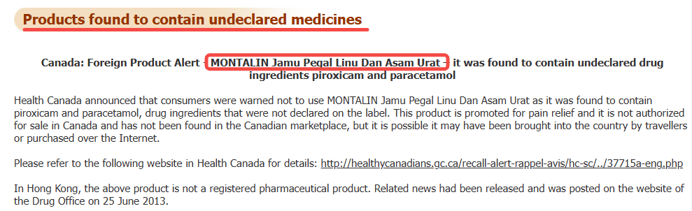 ثالثًا: أقر مكتب الأدوية التابع لإدارة الغذاء والدواء في هونغ كونغ أن وزارة الصحة الكندية قد أعلنت تحذيرًا للمستهلكين من استخدام منتج “مونتالين”، لأنه يحتوي على بيروكسيكام وباراسيتامول، وهما من المكونات الدوائية التي لم يُصرّح بها على الملصق. ويُروّج لهذا المنتج على أنه مخصّص لتخفيف الألم، لكنه غير مصرح ببيعه في كندا، ولم يُعثر عليه في الأسواق الكندية، إلا أن هناك احتمالاً أن يكون قد أُدخل إلى البلاد من قبل مسافرين أو تم شراؤه عبر الإنترنت. كما أقر المكتب أن هذا المنتج غير مسجل كدواء رسمي في هونغ كونغ.