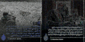 مقارنة نتيجة تحليل مستوى الضوضاء لصورة الادعاء (إلى اليمين) مع نتيجة نفس التحليل لإحدى تصاميم قناة الجزيرة الأصلية