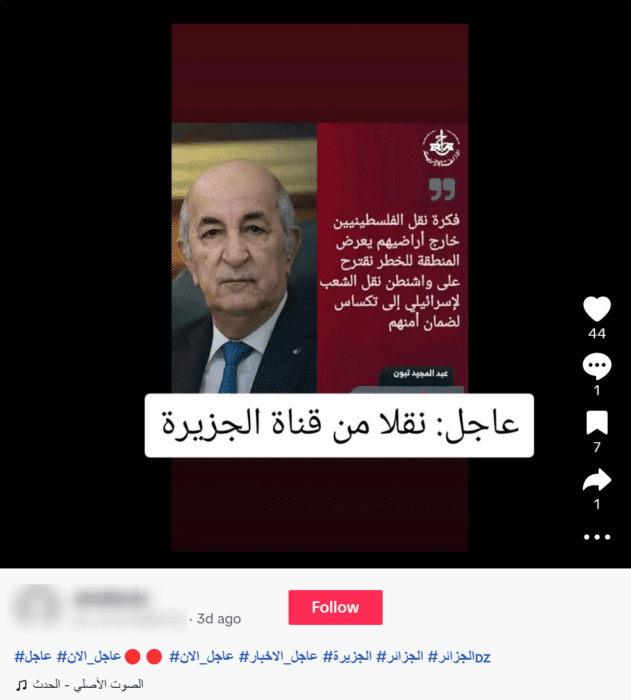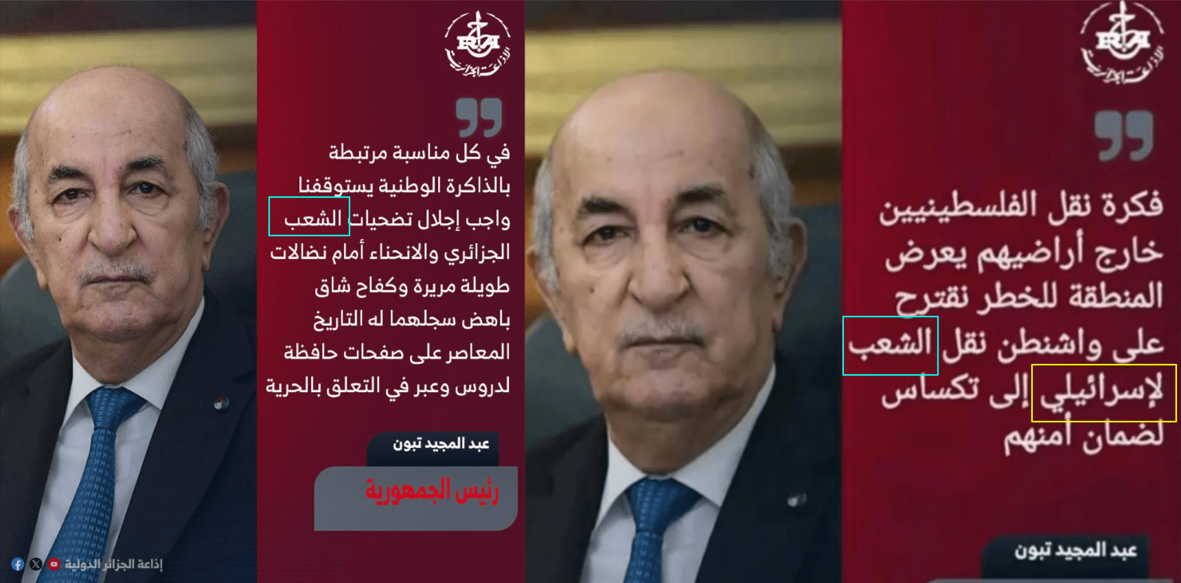 هذا ويتضمن التصريح المفبرك في صورة الادعاء أخطاء إملائية لا تقع فيها الشبكات الإخبارية مثل الإذاعة الجزائرية، حيث كتبت كلمة “الإسرائيلي” بدون حرف الألف، بالإضافة إلى عدم استعمال أي علامات ترقيم في الجملة.