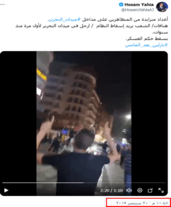 باستكمال البحث بهذه التفاصيل، نقع على مشاهد الادعاء ذاتها نشرها أحد مستخدمي إكس في 20 سبتمبر 2019 على أنها توثق تظاهرة على مدخل ميدان التحرير في القاهرة ذلك اليوم.