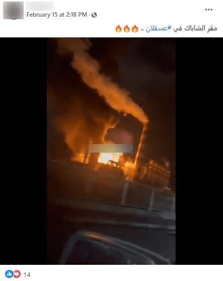 إثر ذلك تداول ناشطون على الفيسبوك مقطع فيديو يدعون أنه يظهر حريق في الشاباك في عسقلان مؤخراً،