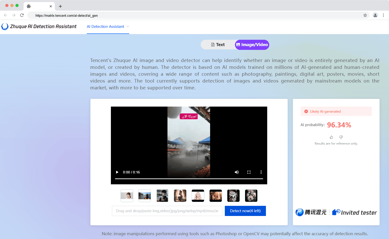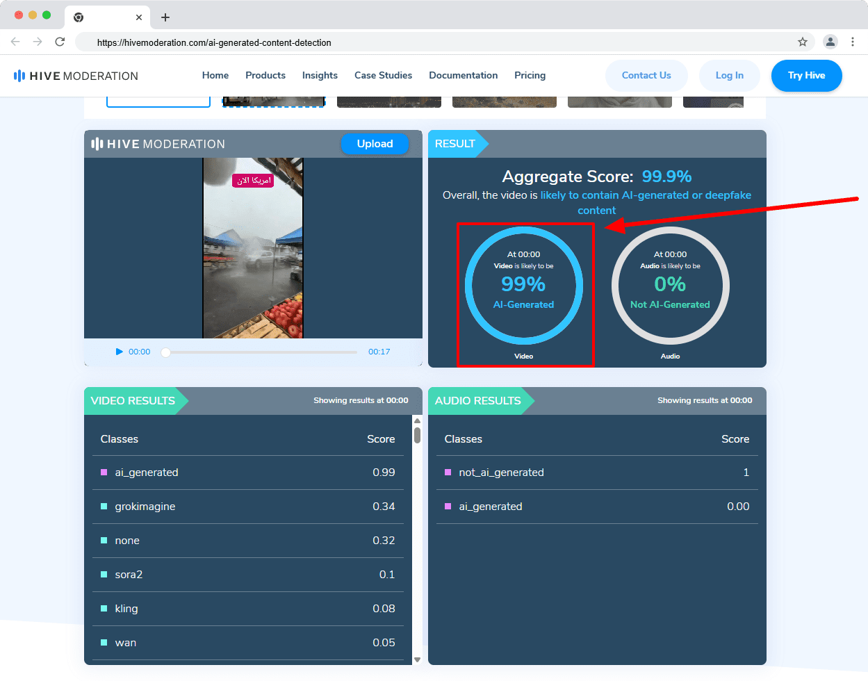 كما أظهرت الفحوص التي أجريت على الفيديو باستخدام عدة أدوات متخصصة في كشف وتحليل المقاطع المولّدة بالذكاء الاصطناعي، بما في ذلك Hivemoderation وTruthScan وTencent’s Zhuque AI، أن احتمالية كونه مولّدًا بالذكاء الاصطناعي مرتفعة جدًا، حيث تجاوزت في بعض الفحوص 99.9%