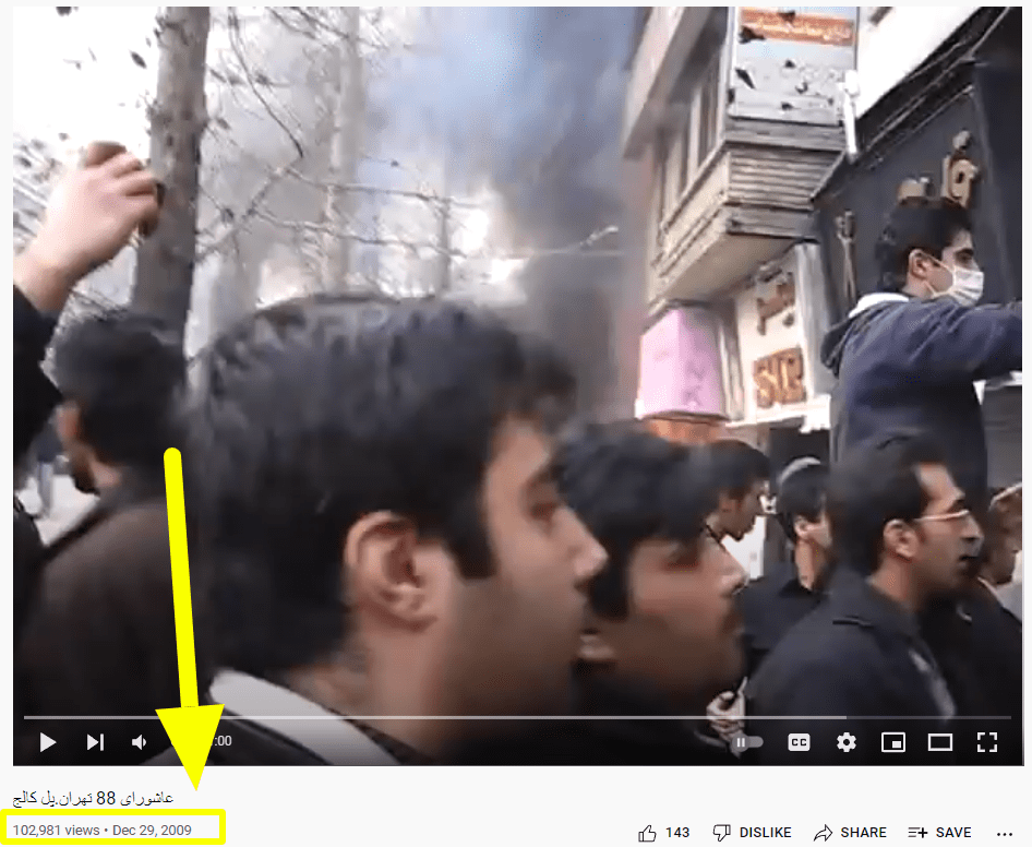 تحت عنوان: “عاشوراء ٨٨ طهران جسر الكلية” مرفقًا في النص الوصفي للمقطع أنه التقط أسفل جسر الكلية في طهران،