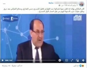 تناقل ناشطون على فيسبوك مقطعًا يدعون أن يظهر رئيس الوزراء العراقي الأسبق وزعيم ائتلاف دولة القانون “نوري المالكي“، يعلن أنه أقام دعوى قضائية ضد قيادي في التيار الصدري،