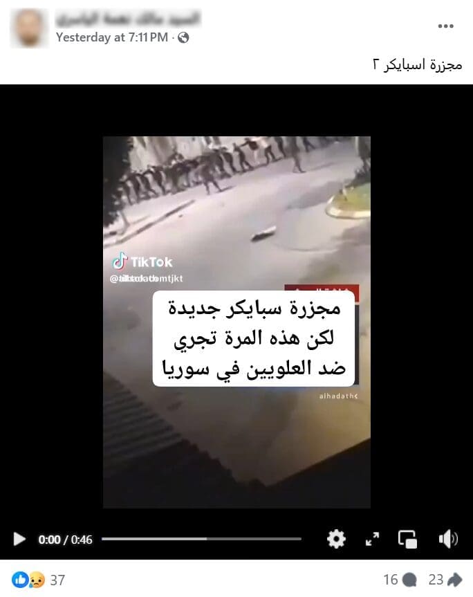 بحسب فرانس 24 –دون تصرف-: “عقب اشتباكات عنيفة في محافظة اللاذقية بين قوات الأمن ومسلحين موالين للنظام منذ الخميس الماضي، كثفت قوات الأمن السورية الجمعة انتشارها ونفذت عمليات تمشيط في المنطقة الساحلية معقل الأقلية العلوية التي ينتمي إليها بشار الأسد. وعلى هامش حملتها الأمنية، قال المرصد السوري لحقوق الإنسان، إن قوات الأمن نفذت عمليات إعدام بحق العشرات في المنطقة. في المقابل، نقلت وكالة الأنباء الرسمية “سانا” عن مصدر أمني في وزارة الداخلية حديثه عن “تجاوزات فردية”، دون تقديم أي تفاصيل إضافية”، إثر ذلك تداول ناشطون على فيسبوك مقطع فيديو يدعون فيه أنه يصور مجزرة ضد العلويين في سوريا.