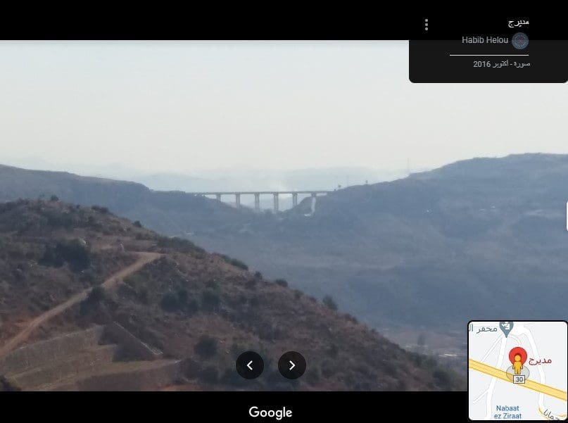 فيما تظهر صورة من خرائط جوجل لنقطة المديرج في لبنان جسراً مغايراً للذي ظهر في مقطع الادعاء، كما في الصورة الآتية.