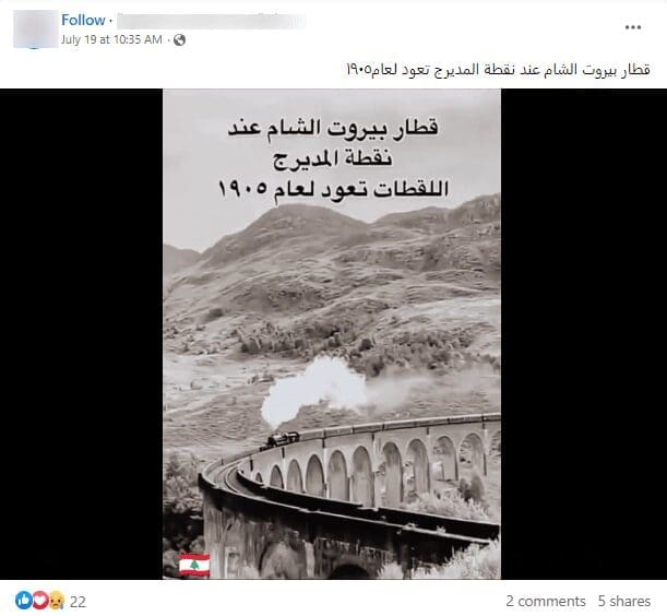 تناقل بعض مستخدمي منصات التواصل مقطعاً يدعون أنه لقطارٍ كان يربط بين بيروت ودمشق وتم التقاطه عام 1905 في جسر المديرج،