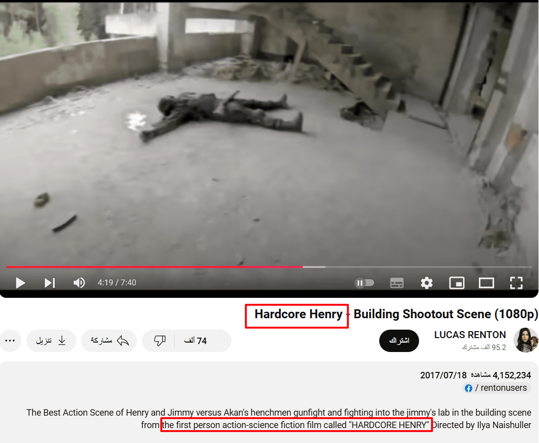 وباستكمال البحث بلقطة واضحة من المقطع الأخير، بيّنت النتائج أنه مقتبس من فيلم سينمائي يدعى “Hardcore Henry”،