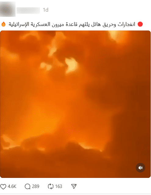 وتداول الفيديو منذ مايو 2021 ينفي أن يكون حديثًا ويظهر انفجارات وحرائق اندلعت في قاعدة ميرون العسكرية مؤخرًا.