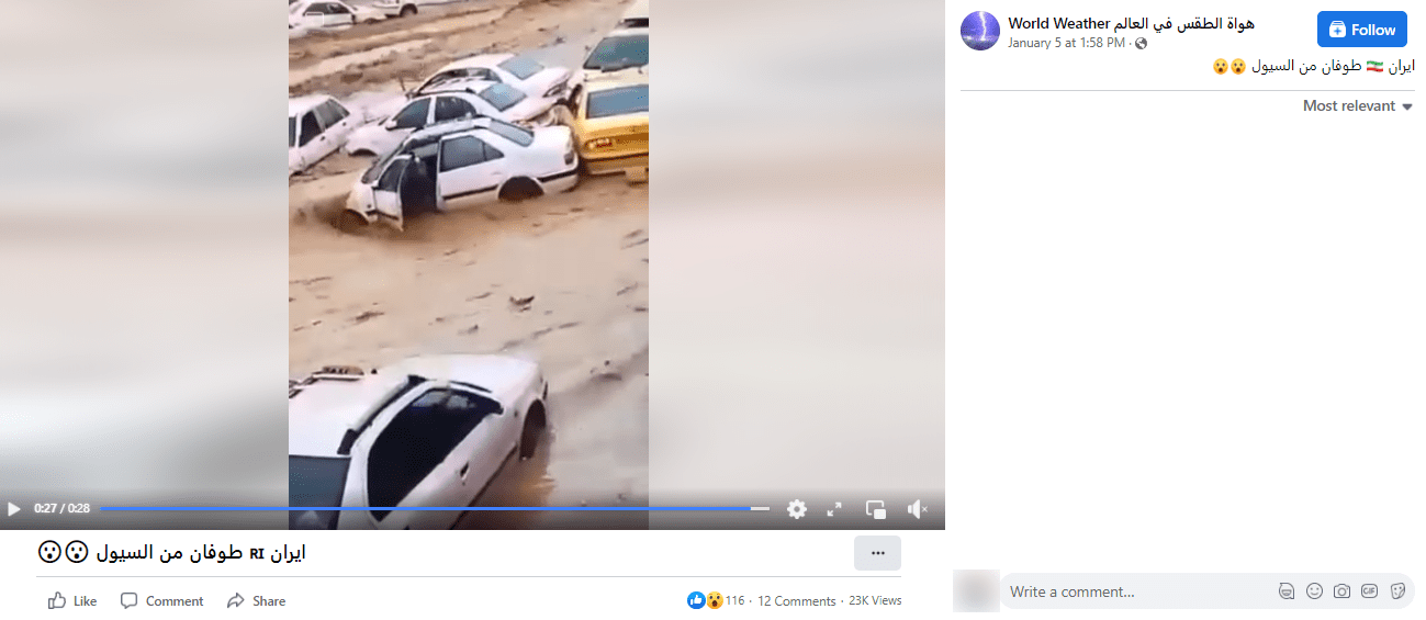 انتشر على مواقع التواصل الاجتماعي مقطع فيديو يظهر انجراف السيارات بسبب الفيضانات والسيول ويزعم ناشروه أنه التقط حديثًا في إيران،