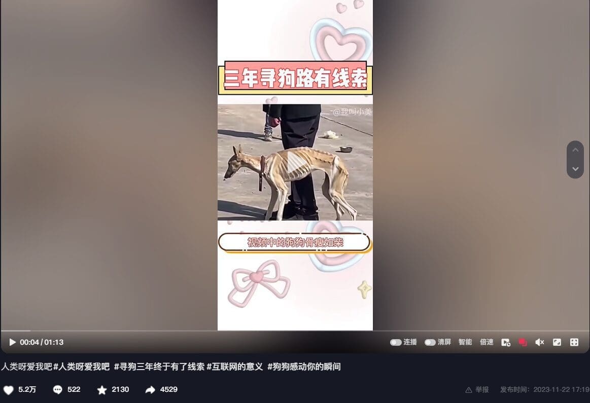 إذ نشر حساب على المنصة مشاهد المقطع ذاتها بتاريخ 22 نوفمبر 2023،مبينًا أنها تظهر كلبًا عثر عليه أخيرًا بعد 3 سنوات من البحث.