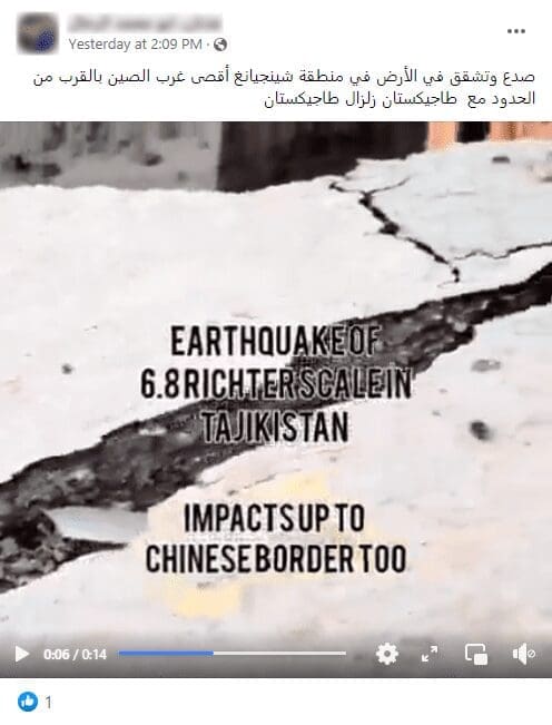 إثر ذلك تداول ناشطون على منصة فيسبوك مقطع فيديو يدّعي ناشروه أنه يظهر حدوث تشققات في منطقة شينجيانغ – الصين
