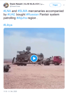 أرشد البحث العكسي عن لقطة ثابتة من مقطع الادعاء على محرك البحث ياندكس إلى مشاهد الادعاء ذاتها متداولة على منصة يوتيوب في 9 أكتوبر 2020 على أنها تظهر رصد نظام الدفاع الجوي الروسي “بانتسير” مثبتًا على مركبة MAN SX45 وشاحنة أخرى في منطقة الجفرة، ليبيا.