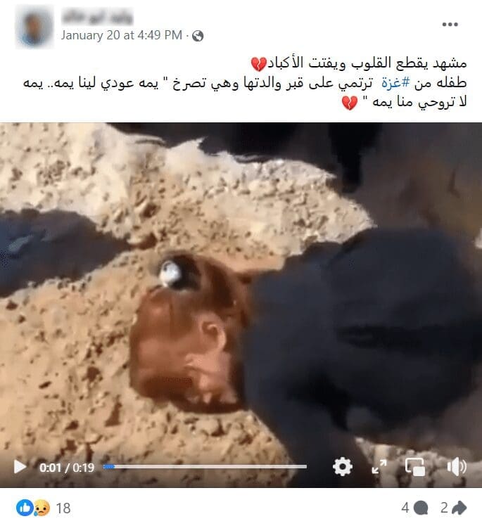 هذا المقطع قديم من العراق، وليس لطفلة من غزة تبكي على قبر والدتها