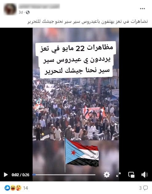 تناقل بعض الناشطين على الفيسبوك مقطع فيديو يدّعي ناشروه أنه يظهر مظاهرات في تعز لدعم عيدروس الزبيدي.