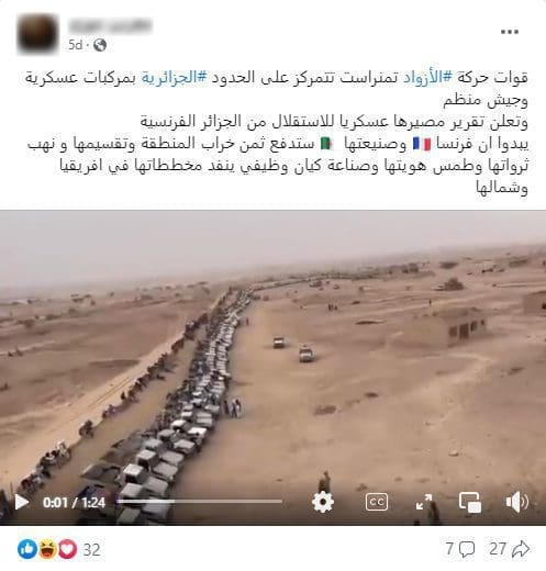 تناقل ناشطون على الفيسبوك مقطع فيديو يدّعي ناشروه أنه يظهر احتشاد قوات حركة أزواد في تامنراست على الحدود الجزائرية‎.