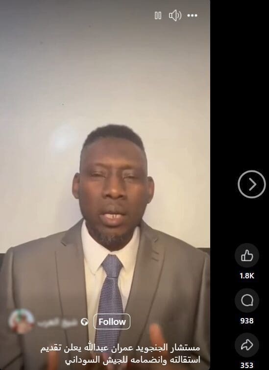 مستشار الجنجويد عمران عبدالله يعلن تقديم استقالته وانضمامه للجيش السوداني