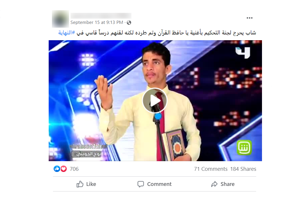 انتشر على مواقع التواصل الاجتماعي مقطع فيديو يزعم ناشروه أنه يظهر شاب يلقي أنشودة دينية في برنامج المواهب وتأثر لجنة التحكيم، فما حقيقة هذا المقطع؟