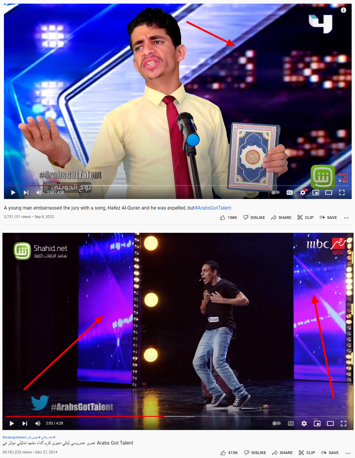 إلا أنه في المشاهد الأصلية من برنامج المواهب تكون زوايا التصوير متعددة ومتغيرة دائما عكس ما يظهر في الادعاء،