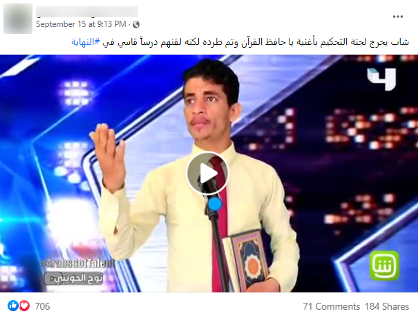 هذا المقطع مركب ولا يظهر شاب يلقي أنشودة دينية في برنامج المواهب العربي