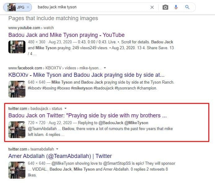 عند تقطيع المقطع الى صور ثابتة والبحث عن واحدة من الصور في محرك البحث غوغل، تظهر لنا العديد من النتائج التي تعود إلى مقطع الادعاء وكان من النتائج تغريدة للملاكم السويدي بادو جاك على تويتر