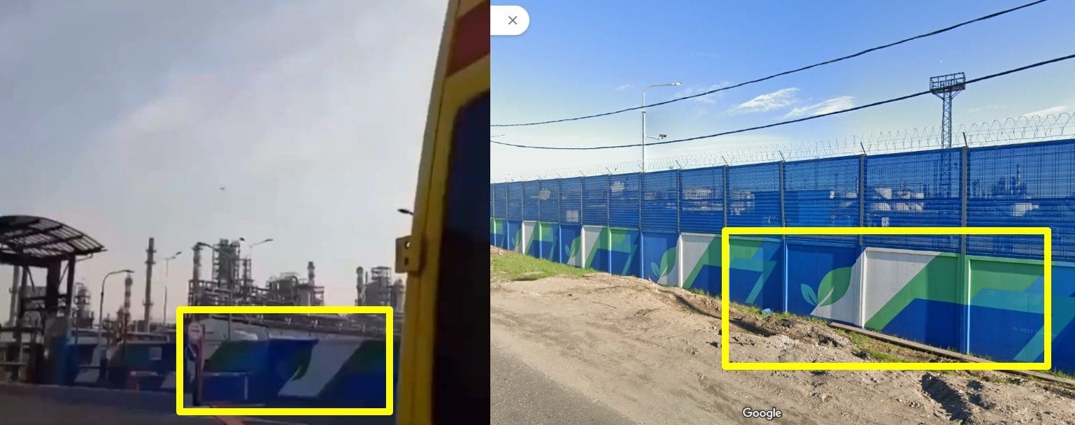 علاوة على ذلك؛ يمكن مقارنة معالم المكان حول مصفاة “OAO PNZ OIL REFINERY” التي توفرها خرائط جوجل، مع مشاهد من مقطع الادعاء،