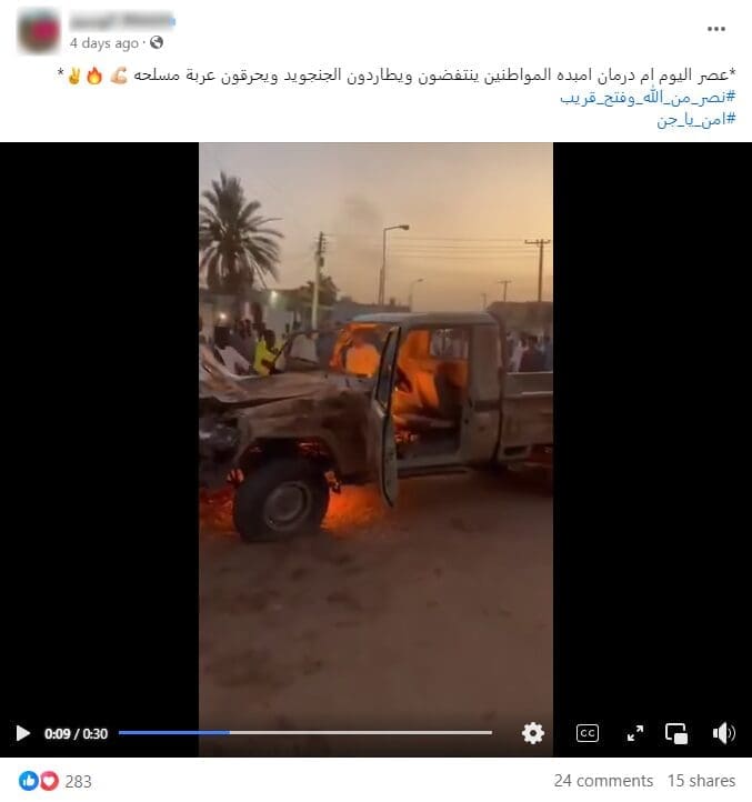 فيما قاد البحث بالكلمات الدلالية في محرك البحث جوجل إلى مقطع يعرض لقطات مشابهة نشرته إحدى صفحات المواقع الإخبارية الدولية في 30 يونيو 2023، يبين حرق سيارة تتبع لقوات الدعم السريع كرد فعل من مواطنين بمنطقة أمبدة غربي أمدرمان.