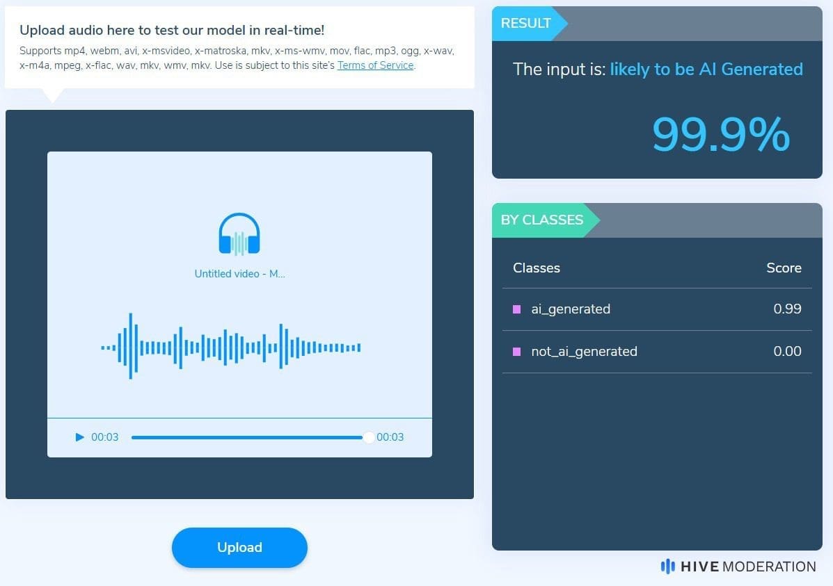 حيث وباستخدام خدمة تحليل الأصوات التي توفرها أداة HIVE يظهر أن احتمالية أن تكون الثواني التي قال فيها رونالدو كلمة غزة مولدة بالذكاء الصناعي بنسبة 99.9%.