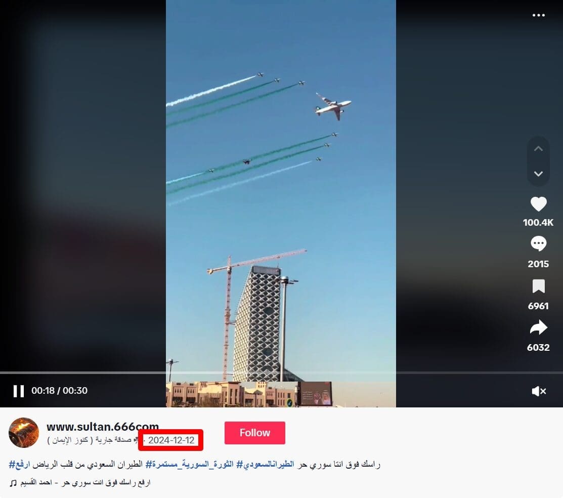 بالعودة إلى الحساب الظاهر على المقطع في منصة التيكتوك؛ تبين أن المقطع قديم، إذ نشره بتاريخ 12 ديسمبر 2024، وتداول المقطع منذ 12 ديسمبر 2024 ينفي أن يكون له علاقة بزيارة الرئيس الانتقالي أحمد الشرع إلى السعودية مؤخرًا.