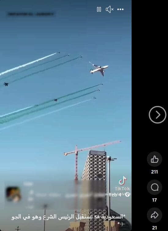 بحسب فرانس24: «يقوم رئيس المرحلة الانتقالية في سوريا أحمد الشرع الأحد بزيارة إلى السعودية، هي الأولى منذ تعيينه في هذا المنصب خارج البلاد. والتقى الشرع  ولي العهد السعودي الأمير محمد بن سلمان وهو ثاني زعيم خليجي يجتمع مع الشرع منذ توليه الرئاسة الانتقالية في لسوريا. وتعمل دمشق والرياض على تعزيز العلاقات في مرحلة ما بعد الأسد. وتعول سوريا على دعم الدول العربية لا سيما الخليجية منها، في إعادة إعمار البلاد ومعالجة تداعيات النزاع المدمر الذي امتد 13 عاما.» إثر ذلك تداول ناشطون على الفيسبوك مقطع فيديو يدعون أنه يظهر مشاهد من استقبال الرئيس الانتقالي بالطائرات في سماء السعودية.