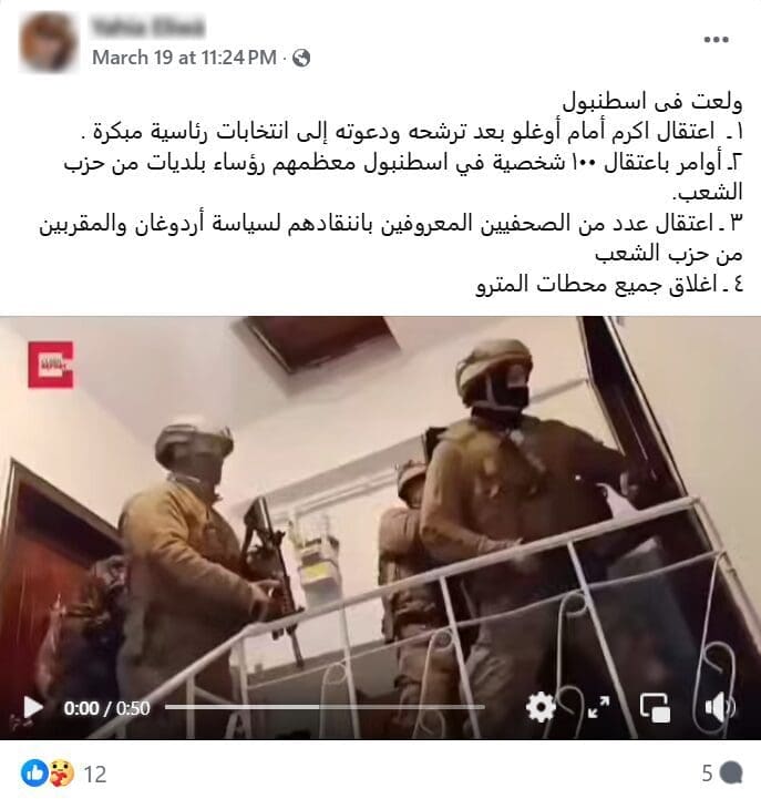 بحسب فرانس 24 -دون تصرف-: «اعتقلت الشرطة التركية الأربعاء رئيس بلدية إسطنبول أكرم إمام أوغلو المعارض للرئيس رجب طيب أردوغان حسبما قال أحد مساعديه، وكان موقع صباح الإخباري ذكر في وقت سابق الأربعاء بأن السلطات التركية أمرت باعتقال إمام أوغلو و100 آخرين في إطار تحقيق الفساد.» إثر ذلك تداول ناشطون على الفيسبوك مقطع فيديو يدعون أنه يظهر لحظة اعتقال أكرم أوغلو.