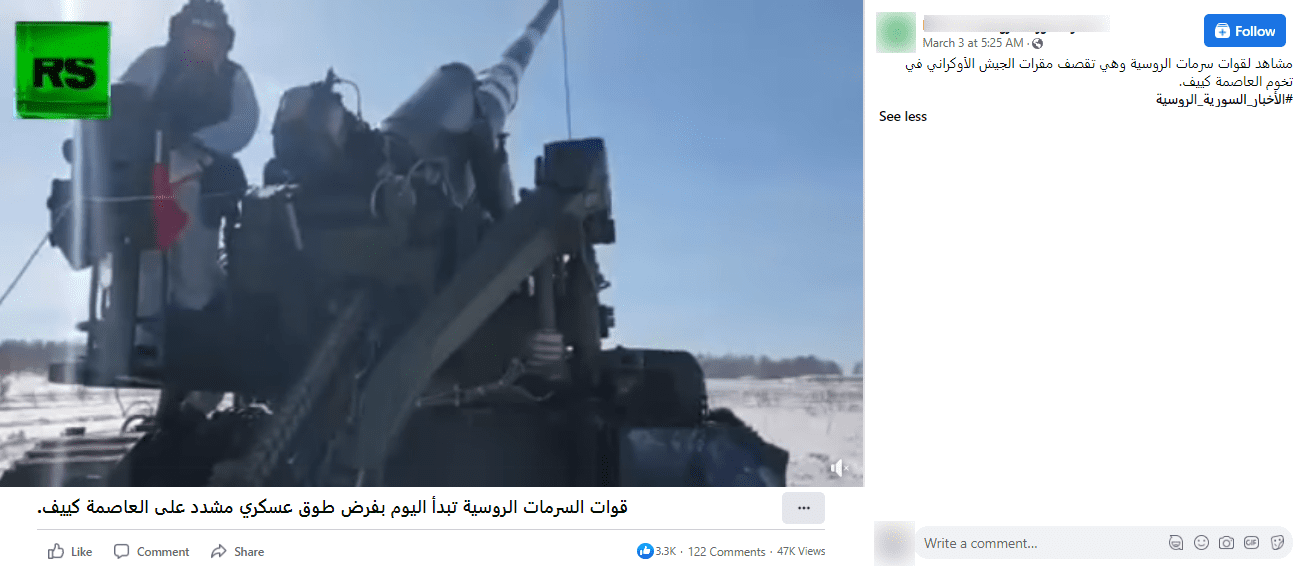 إثر ذلك، تداول ناشطون على مواقع التواصل الاجتماعي مقطع فيديو يزعمون أنه يظهر مدافع روسية تقصف العاصمة الأوكرانية كييف،