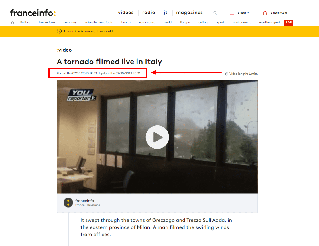 عثر فريق منصة فتبينوا على مقطع الادعاء ذاته في موقع francetvinfo الذي نشره بتاريخ 30 يوليو 2013 تحت عنوان: تصوير مباشر لإعصار في إيطاليا،