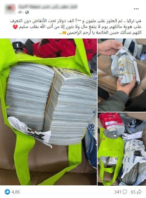 إثر ذلك تداول ناشطون على موقع الفيسبوك صورًا يدعون أنها تُظهر دولارات عُثر عليها تحت الأنقاض في تركيا مؤخرًا،