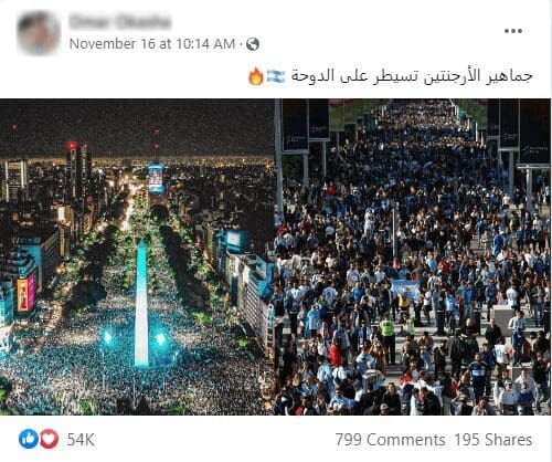 انتشر على موقع التواصل الاجتماعي فيسبوك صورًا يزعم ناشروها أنها تُظهر جماهير منتخب الأرجنتين في أحد شوارع الدوحة لدعم منتخب بلادهم.