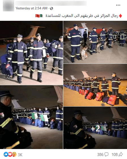 في أعقاب ذلك، تناقل ناشطون على منصات التواصل صوراً يدعون أنها تظهر رجال الحماية المدنية في الجزائر في طريقهم الى المغرب لتقديم يد العون،