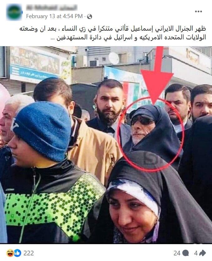 في هذا السياق تداول ناشطون على الفيسبوك صورة يدعي ناشروها أنها تظهر إسماعيل قآني متنكرًا بزي نسائي خوفًا من الطائرات المسيرة الأميركية،