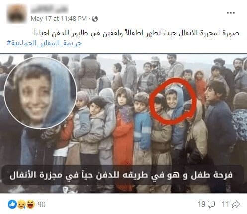 تناقل ناشطون على الفيسبوك صورة يدّعي ناشروها أنها تظهر أطفالًا ينتظرون في طابور للدفن أحياءً في حملة الأنفال.