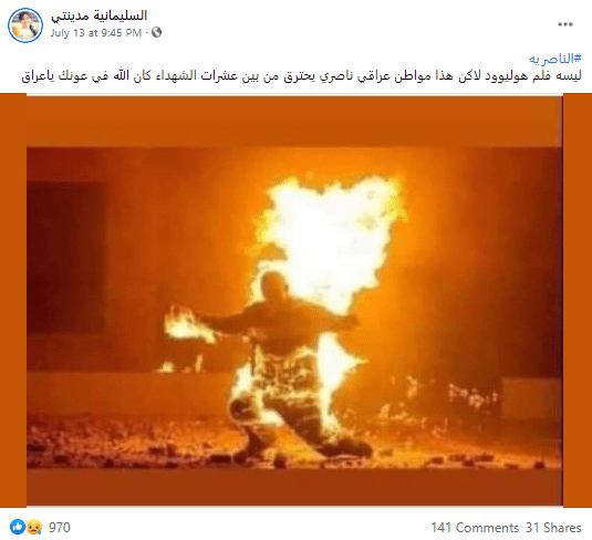 انتشرت على مواقع التواصل الاجتماعي صورة يزعم ناشروها أنها تظهر عراقي يحترق، في اشارة إلى أنها تعود لحادثة حريق مستشفى الناصرية في العراق،