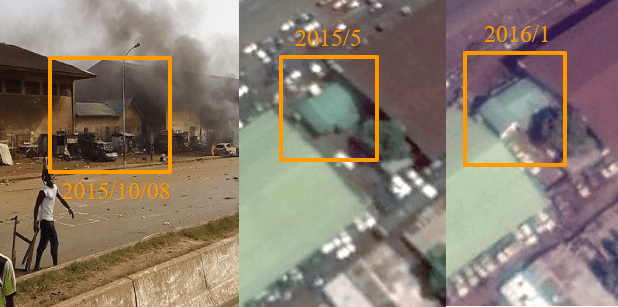 صورة المبنى الصغير الذي يقع وسط المباني الكبيرة بتاريخ مايو 2015 وصورة اخرى لنفس المبنى في يناير 2016 بجانب صورة المبنى من الحادثة يؤكد تاريخ الحادثة بين النصف الثاني من عام 2015 وبداية عام 2016،