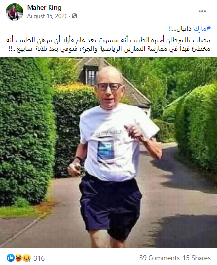 فأراد أن يثبت للطبيب انه مخطئ و بدأ بعد ذلك في ممارسة التمارين الرياضية والجري ثم توفي بعد ثلاثة أسابيع.