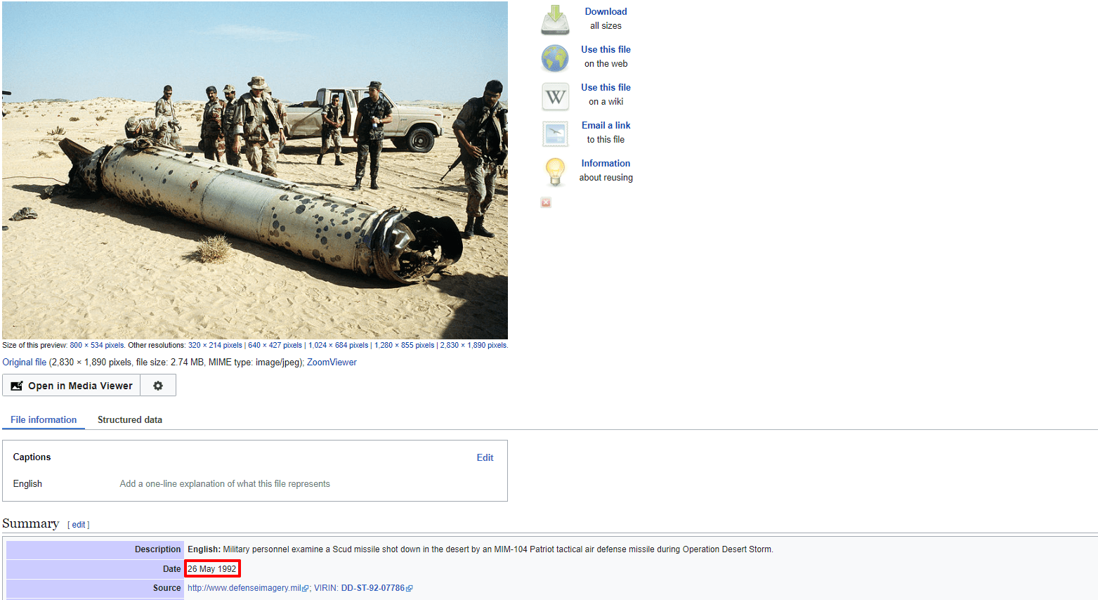 حيث أوضح موقع توزيع الصور “alamy” أن الصورة تظهر صاروخ سكود عراقي مدمر في الصحراء خلال عملية عاصفة الصحراء،
