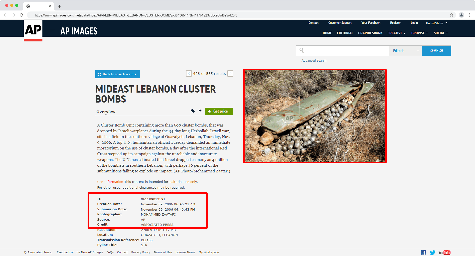 بالرجوع إلى قسم توزيع الصور في وكالة أسوشيتد برس والبحث عن القنابل العنقودية، عثرنا على العديد من الصور المشابهة والمطابقة لصورة الادعاء،