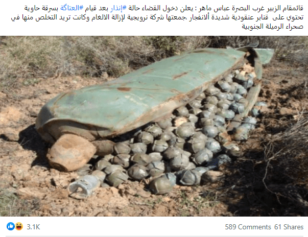 قائمقام الزبير غرب البصرة عباس ماهر : يعلن دخول القضاء حالة #إنذار بعد قيام #العتاگة بسرقة حاوية تحتوي على قنابر عنقودية شديدة ألانفجار ،جمعتها شركة نرويجية لإزالة الالغام وكانت تريد التخلص منها في صحراء الرميلة الجنوبية