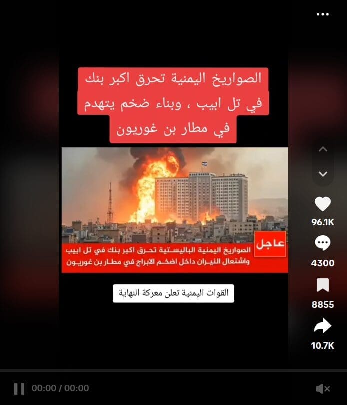 تداول ناشطون على التيكتوك مقطع فيديو يدعون فيه أنه يظهر مشاهد من قصف الحوثي بنك هبينلؤمي في تل أبيب،