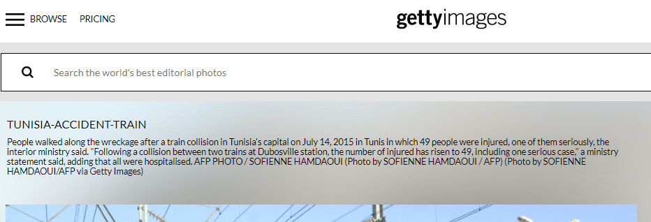 وبالبحث عن حادث التصادم الذي حصل في تونس بنفس التاريخ المذكور من موقع gettyimages باستخدام الكلمات الدلالية “انقلاب قطار تونس”،