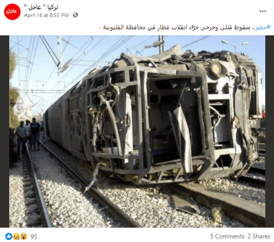 تزامن انتشار الصورة مع انقلاب قطار قرب مدينة طوخ في محافظة القليوبية في مصر بتاريخ 18 ابريل 2021،